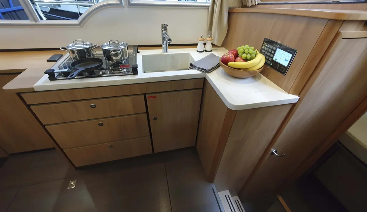 The interior is designed with comfort and ease of use as a priority. The cosy saloon, fully equipped compact kitchen and spacious sleeping quarters offer a feeling of home wherever you sail.