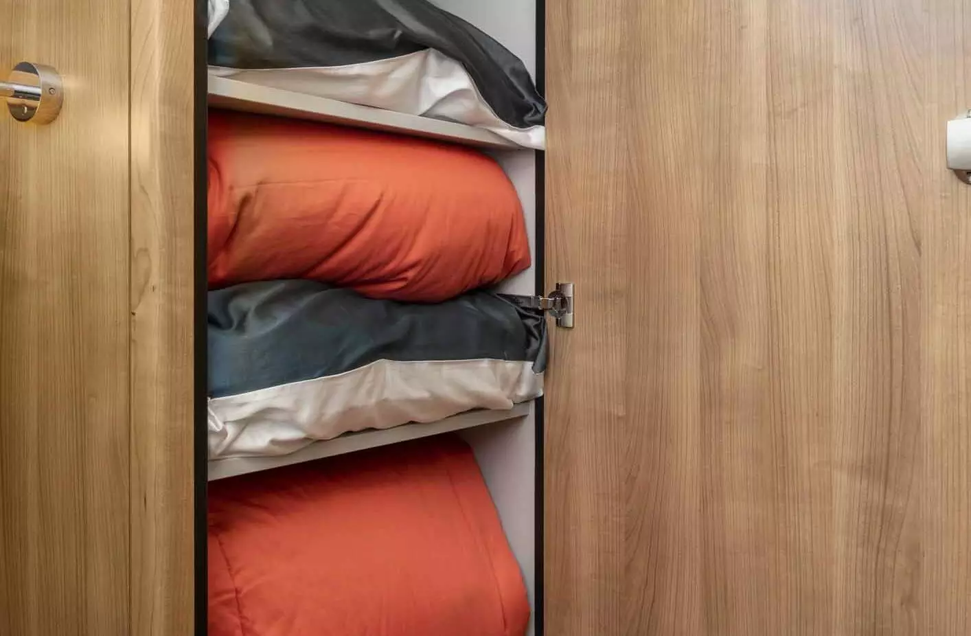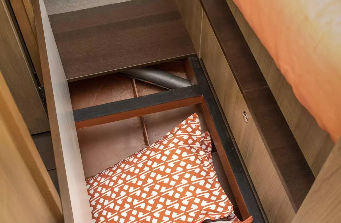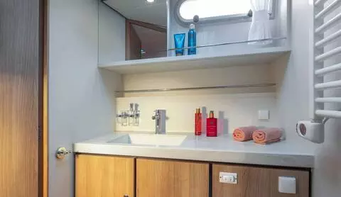 You notice these generous proportions as soon as you enter the saloon. The saloon and kitchen are situated on the same level, with only one step between the saloon and the kitchen compartment, allowing the cook and the guests to enjoy life on board together. Practical, efficiently positioned drawers, cupboards, etc. make life on board very convenient.