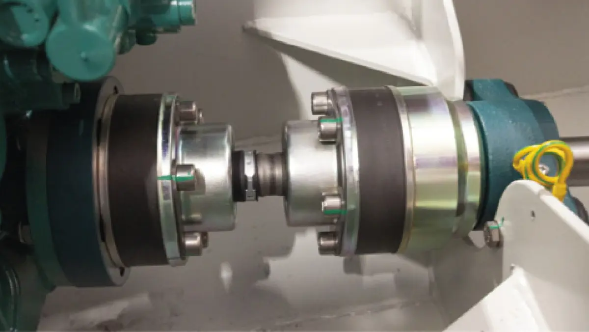 We have placed what is known as a homokinetic coupling between the engine and the propeller shaft. This flexible coupling allows the engine and propeller shaft to move completely independently of each other. This prevents vibrations from being transmitted.