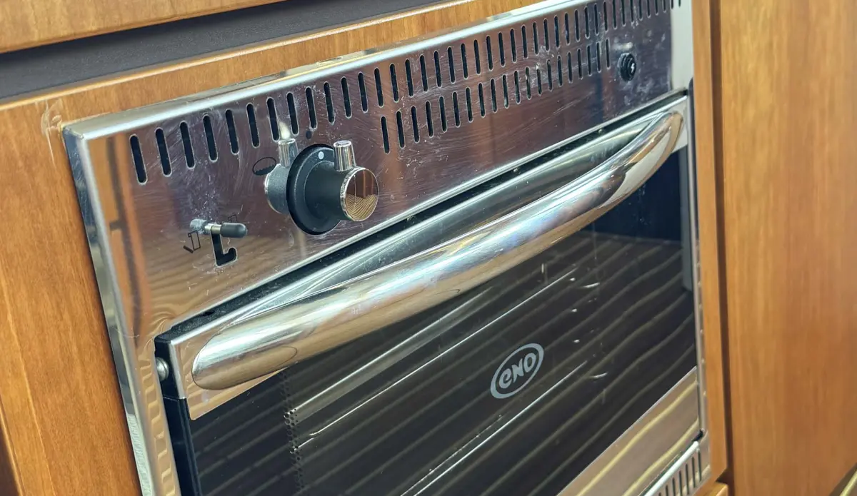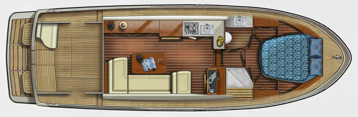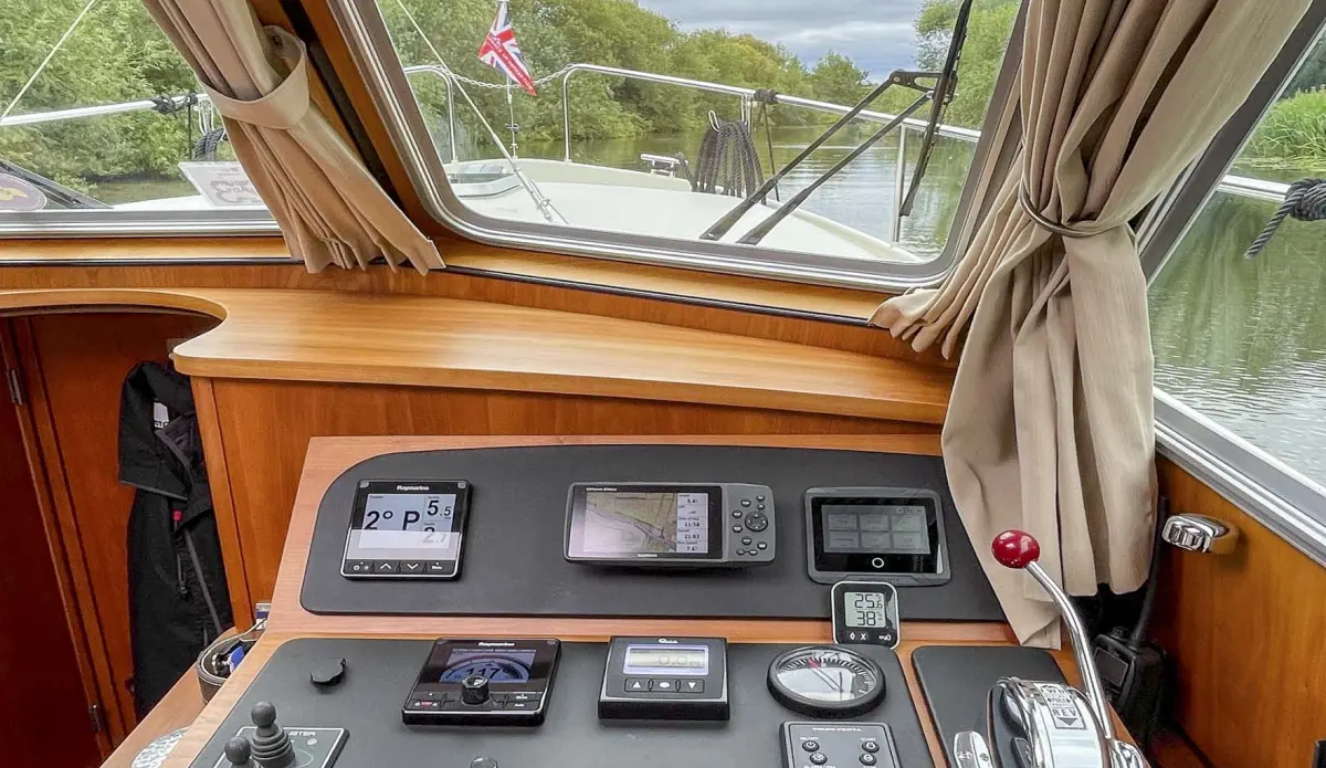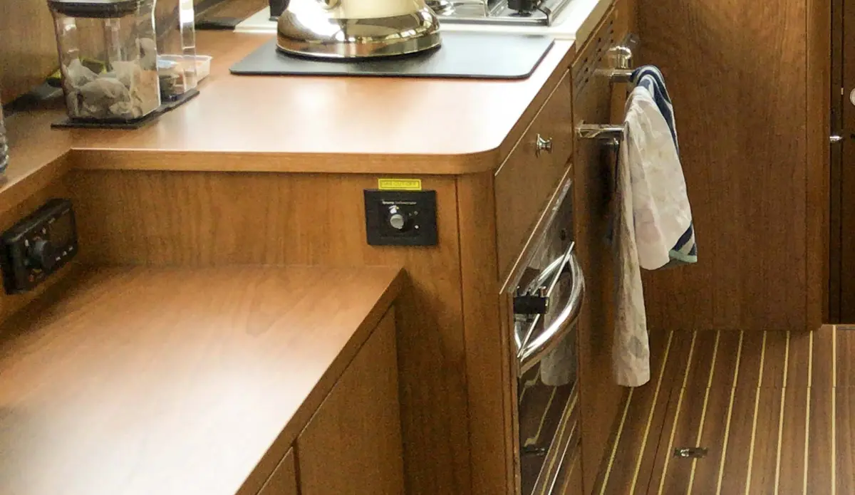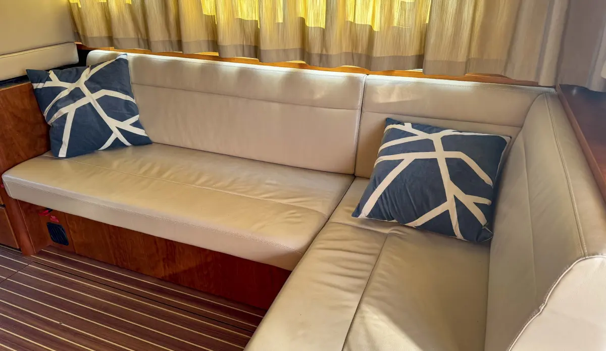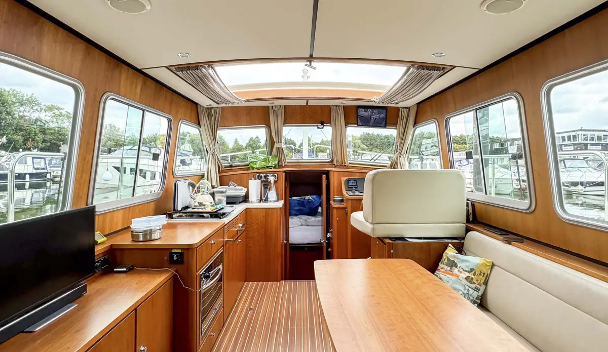 • Saloon with L-shaped leather sofa which pulls out to make Easy Sleep Convert system double bed.   Sideboard on port side with 12v TV with blue tooth speaker, stereo radio and storage cupboards below. Galley area with sink with mixer tap, gas hob, Corian worktops, electric Oven, refrigerator and waste bin. Crockery and cutlery. Starboard helm with full instrumentation and one and half leather helmseat. Access to engine room. Opening window with tinted glass