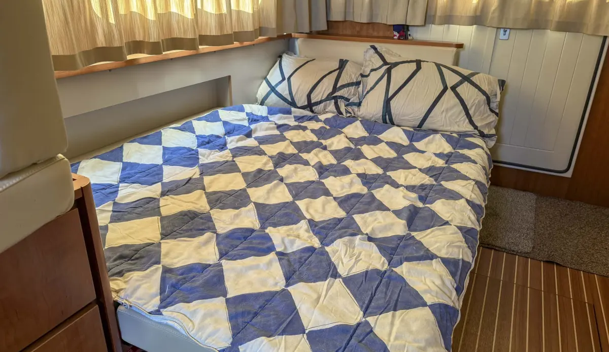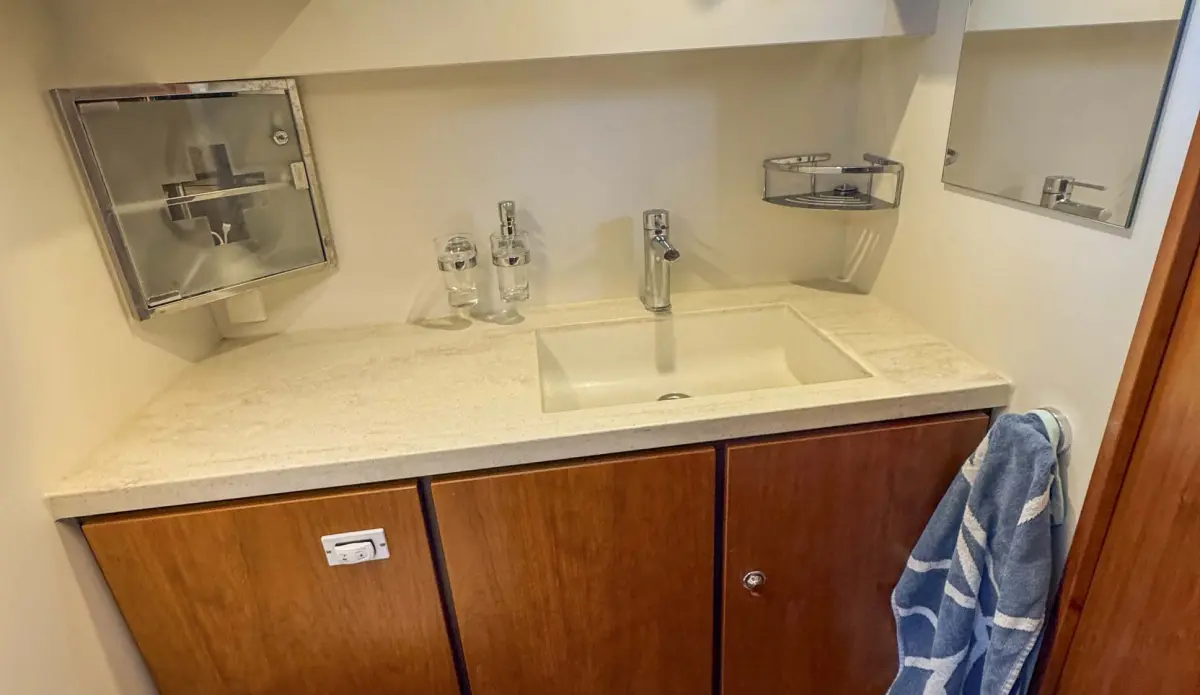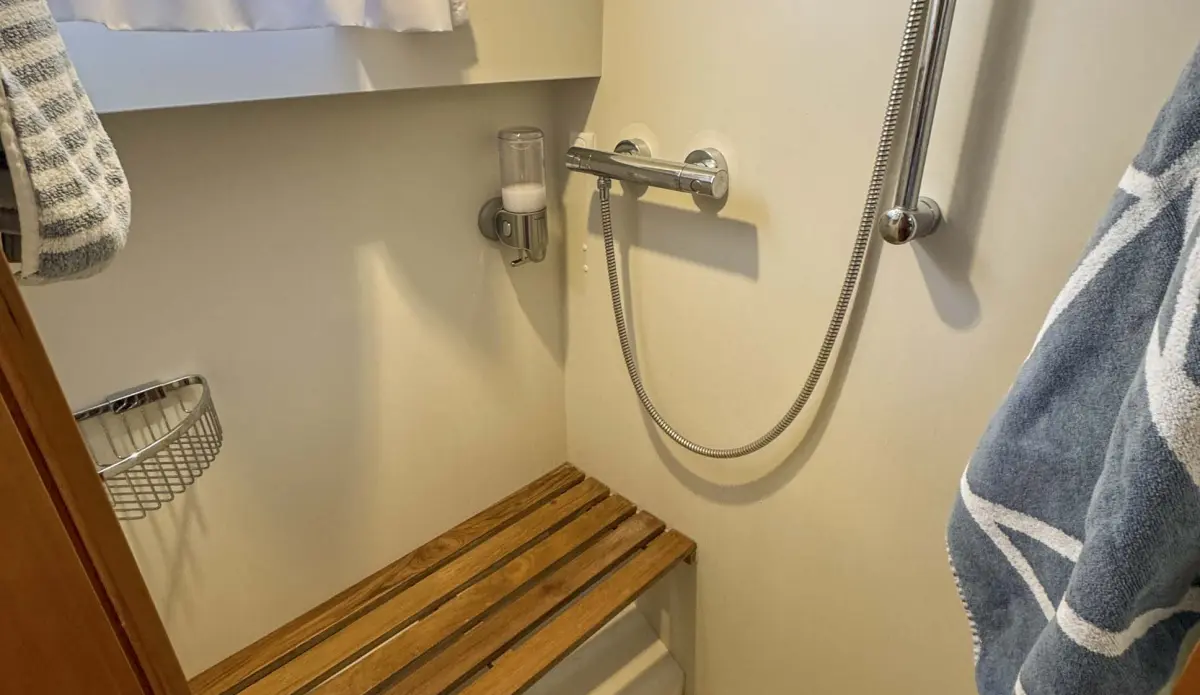 • Three steps down to forward cabin with comfortable double berth, large storage area below berth and port and starboard wardrobes with shelving. Access to anchor locker. Separate shower cubicle on starboard side, basin set in Corian countertop and electric toilet on port side in separate cubicle.