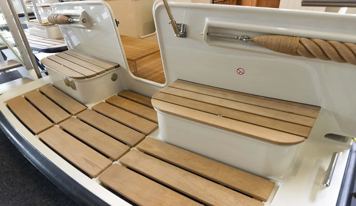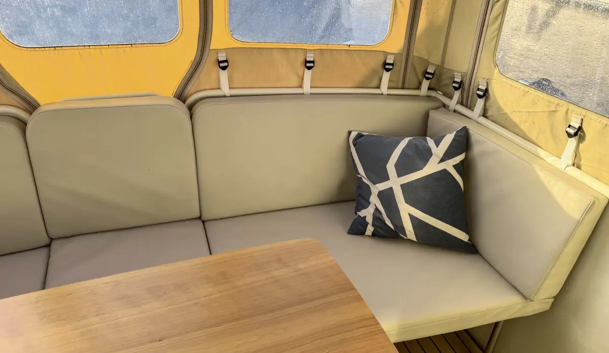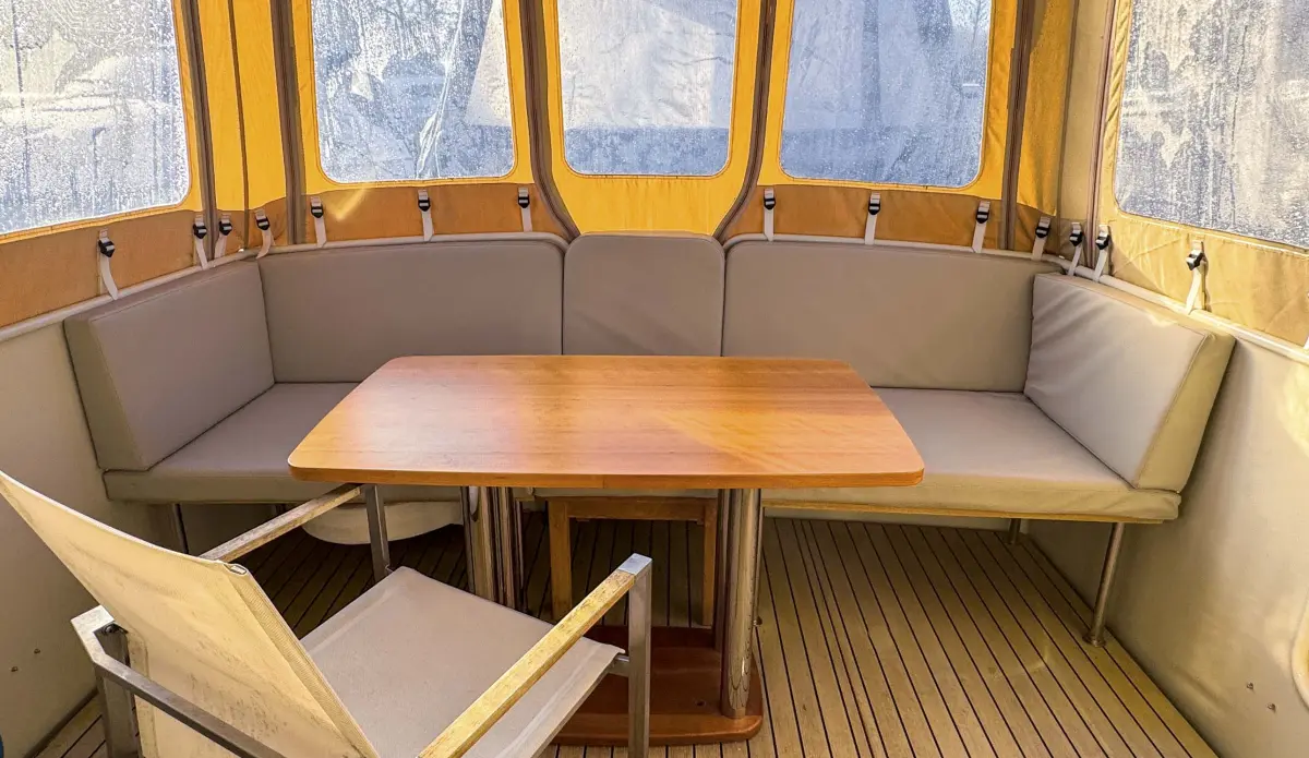 • Teak bathing platform and gas and storage locker, deck shower and sliding boarding ladder. Large open self draining cockpit with lazarette, aft transom gate, side access cut outs. Removable coffee table utilised as centre seat and includes comfortable white vinyl seating for 4+. Additional seat. Cockpit canvas with sides and back panel to provide full aft cockpit enclosure. Double doors to main saloon.