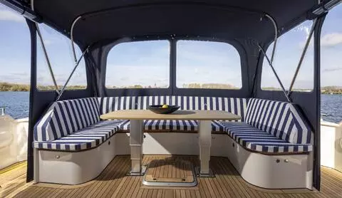 Variotop® wheelhouse with luxurious two-person helmsman’s bench and second bench on the port side. Aft cabin with a free-standing double berth, toilet compartment with washbasin at SB-Side, shower compartment connected to toilet compartment, incl. wardrobes at port side. Saloon with spacious L-shaped settee and galley at SB side. At port side L-shaped dinette and cupboards. Optionally the saloon can be equippend with a galley extension on the port side, combined with a U-shaped settee or a vis-a-vis dinette.