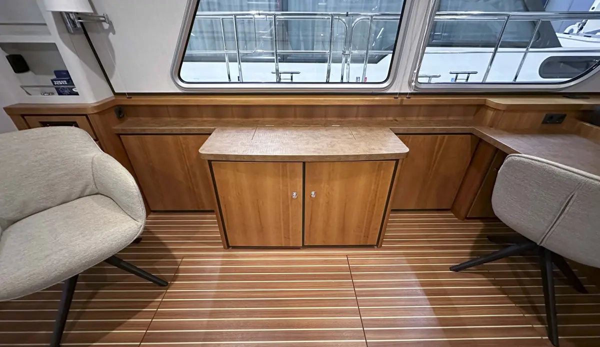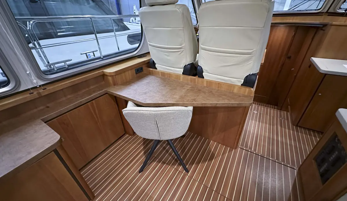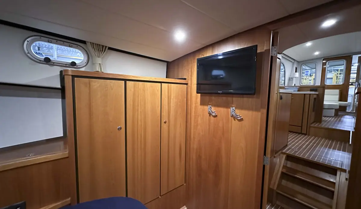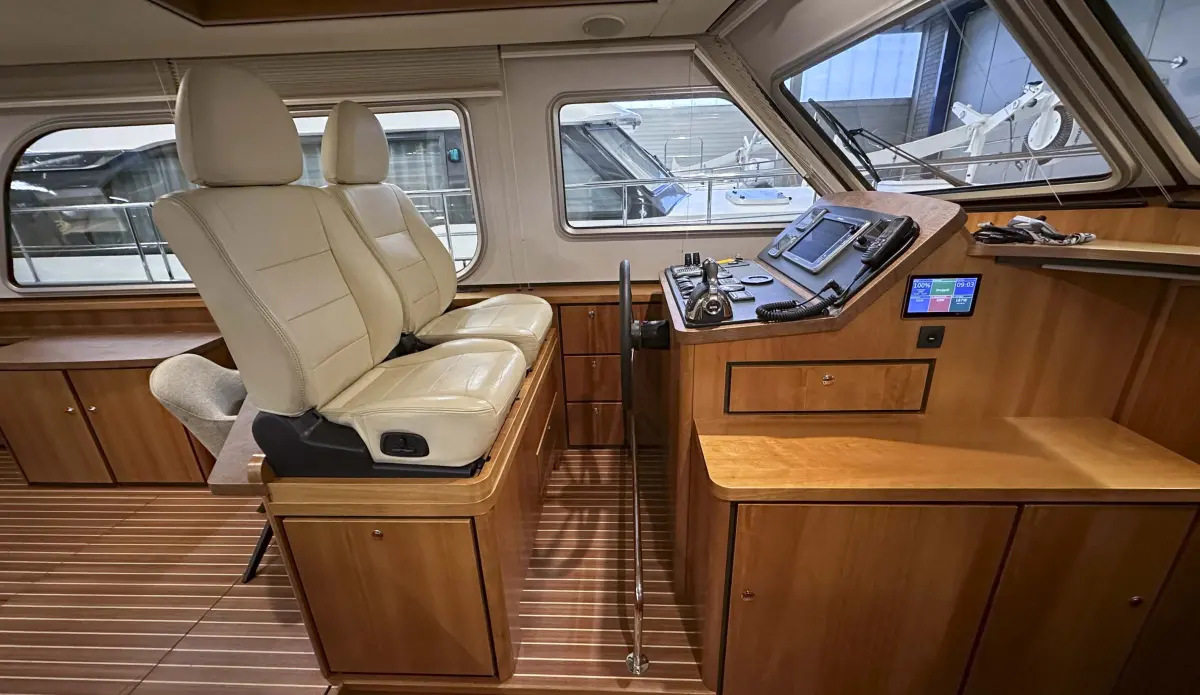 - ceilings made of Vinyl, reading lights in front cabin, interior made of cherry, ship’s floor original Linssen teak coloured with stripes, co-pilot seat, saloon sofa with “Easy Sleep Convert System”; double bed function with integrated storage space