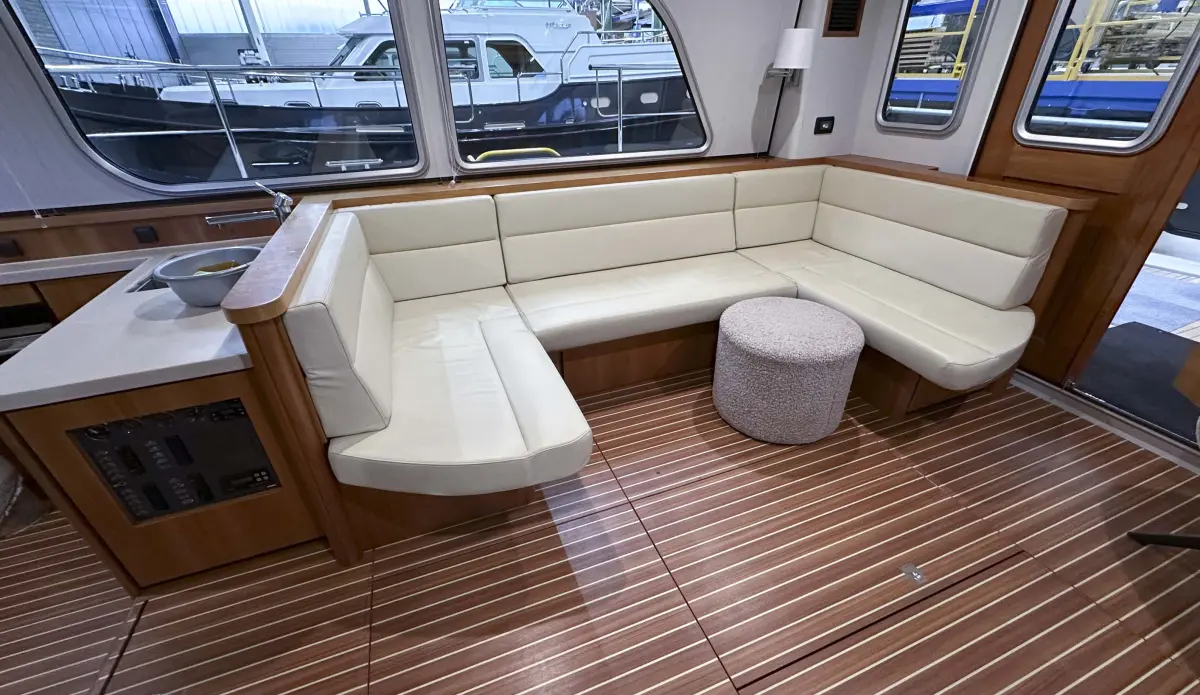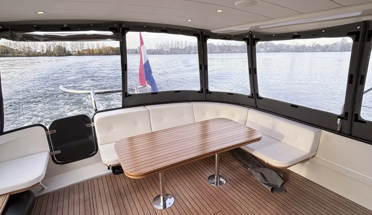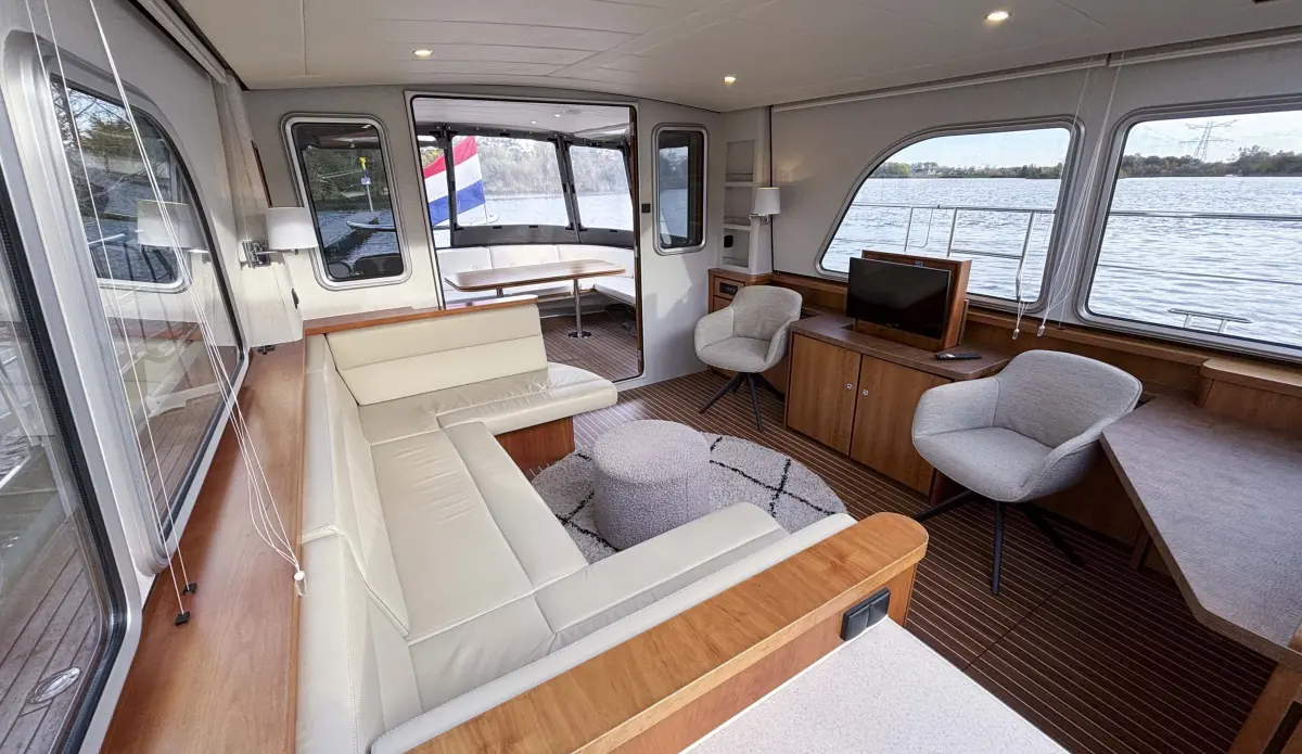 - plafonds uitgevoerd met vinyl, leeslampjes in voorkajuit, interieur in kersenhout, scheepsvloer origineel Linssen teak-look met bies, co-pilot meevaarzit, salonbank uitgevoerd met “Easy Sleep Convert System”; dubbelbedfunctie met geïntegreerde bergruimte