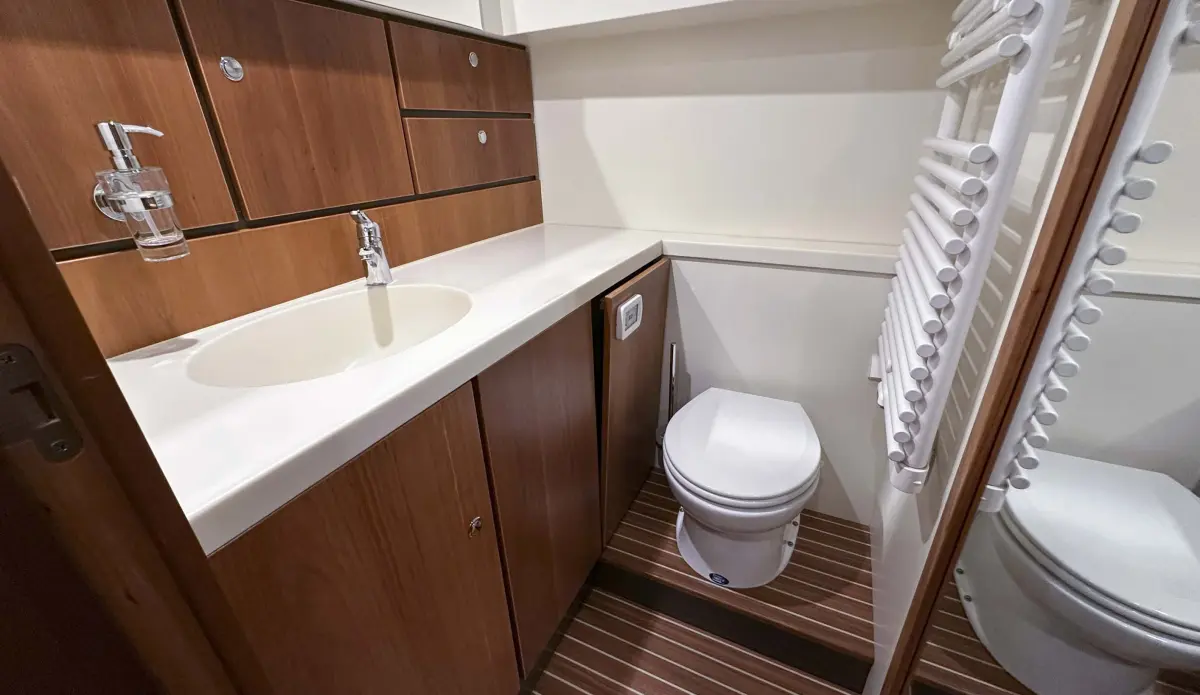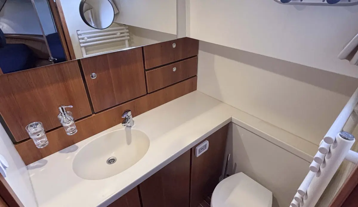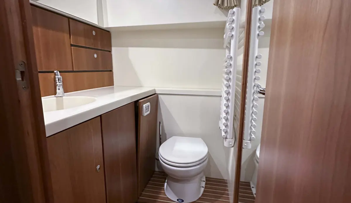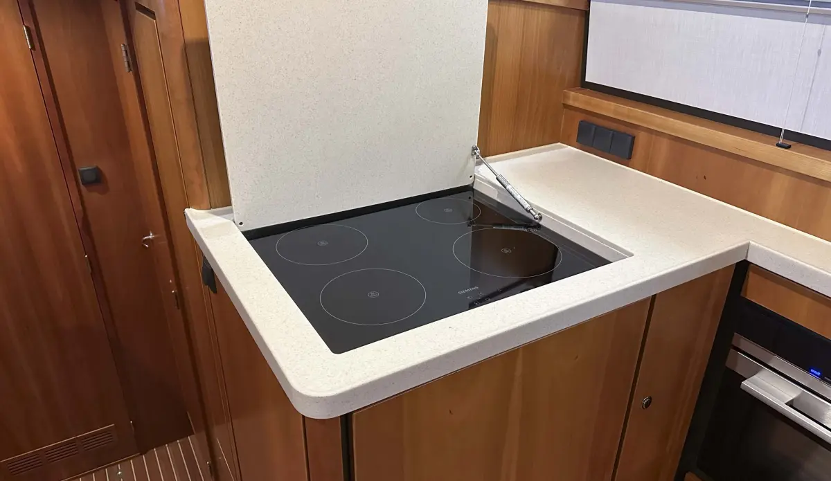 - refrigerator 110 ltr., cooking hob 4 zones induction, galley worktop made of Corian, dishwasher, washing machine with drying function, microwave with oven function and grill function, shower in the front cabin, electric toilet in front cabin fresh water flushed, towel dryer in wet room front cabin, heating system thru air, air conditioning front and side cabin saloon, FM radio with cd player with usb player, television in saloon, automatic fire extinguishing system in engine room