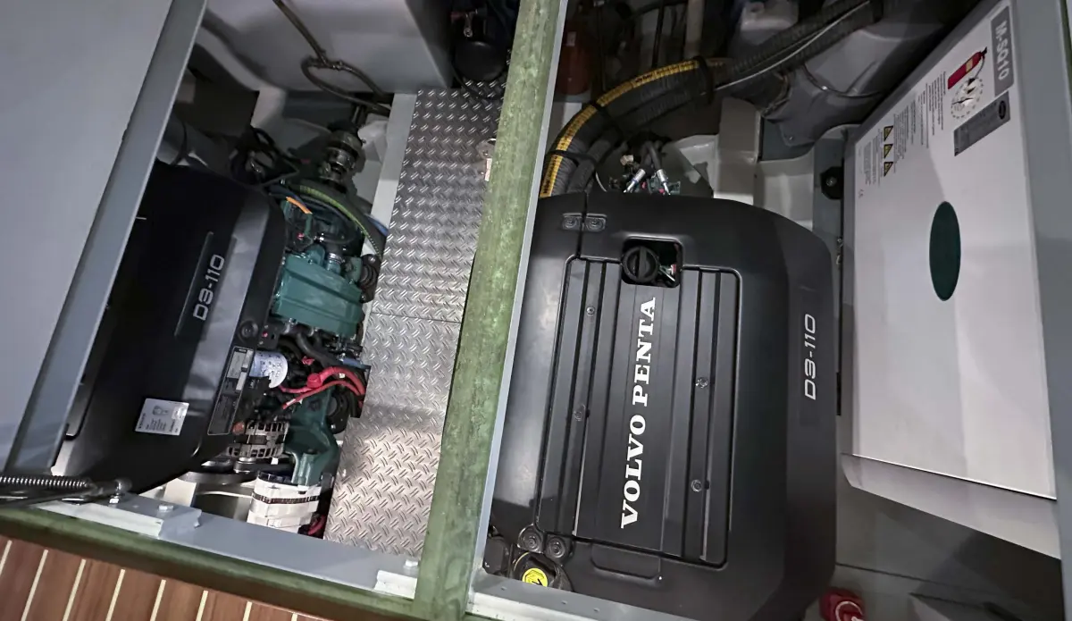 - Bugstrahler elektrisch proportional, Heckstrahler elektrisch proportional, Fernbedienung für Bug- und Heckstrahlruder, umschaltbare Kraftstofffilters, Stabilisierungsanlage Rotorswing 2x elektrisch, Generator Whisper 10 9,4kW, Warmwasserboiler 60 Ltr. über Maschine und 230V Heizelement, Deckwaschanlage Außenwasser, Schwarzwassertank 240 Ltr., Landstromanschluss 230V, Kombiniertes Batterieladegerät mit Umwandler Mastervolt Mass Combi 100A/2200W, Solarpaneele 4x110 Watt, elektronischer Schalthebel Volvo