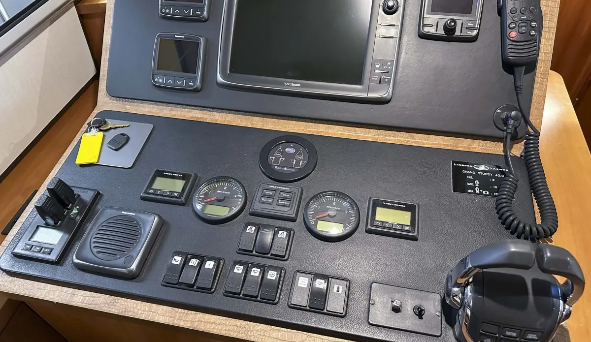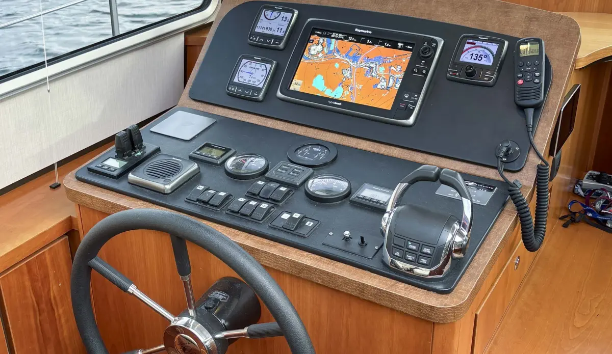 - multifunctional display Raymarine i70 2 x, displays depth temperature rudder, autopilot Raymarine P70R, chart plotter Raymarine Hybridtouch C125 1 x, radar Raymarine Radome 4kW, remote control for autopilot Raymarine S100, remote control for manoeuvring Yacht Controller, AIS; automatic identification system sending receiving, VHF radio Raymarine Ray 260 ATIS DSC