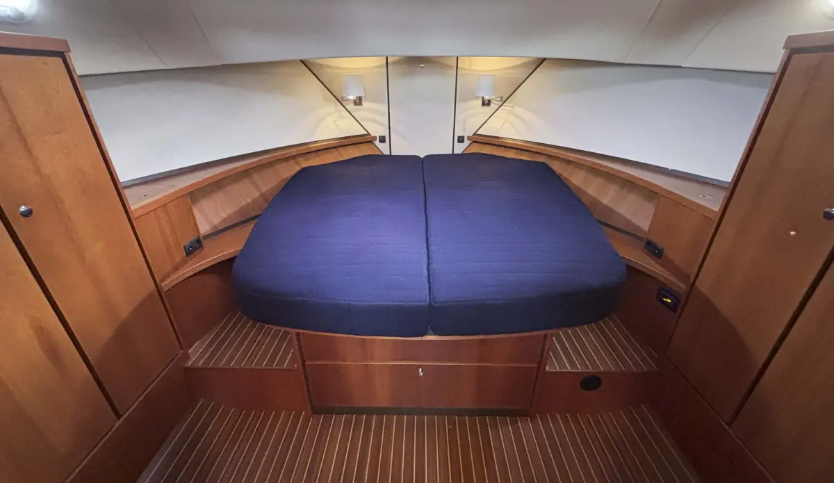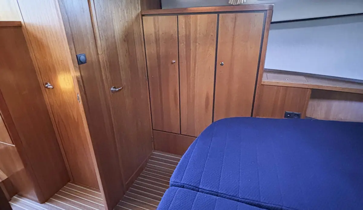 - Decken verkleidet mit Vinyl, Leselampen im Vorderkabine, Innenausbau hergestellt aus Kirschbaumholz, Schiffsboden orginal Linssen teakfarbig mit streifen, Beifahrsitz, Salonbank ausgefürt mit „Easy Sleep Convert System“; Doppelbett-Funktion mit integriertem Stauraum