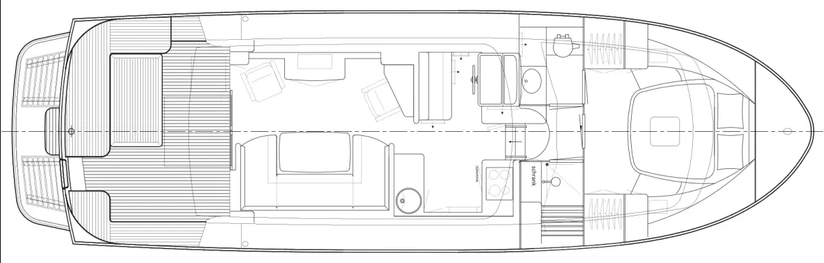 - Wieling, Teakholz auf Achterdeck Vordeck und Gangborde, Kissensatz für Plichtbank, Außendusche, Außenlautsprecher, Ankerwinde elektrisch, Deckbeleuchtung im Mast, Plichtbeleuchtung, Suchscheinwerfer elektrisch